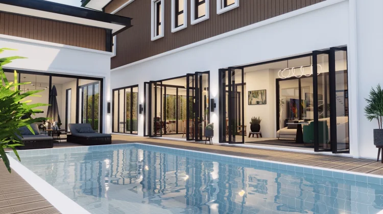 The residence is designed with a horizontal layout for a “wide façade and comfortable living.” The upper floor features a vertical garden concealed behind wooden louvers, serving as both a sun filter and privacy screen. The lower floor embraces an open-plan concept, with folding glass walls that seamlessly connect the pool and wooden deck—creating an indoor–outdoor space that can be enjoyed every day.