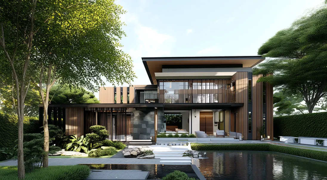 บ้านสำหรับครอบครัวขยายดีไซน์แบบเฉพาะตามผู้อยู่อาศัย ออกแบบอาคารในแนวนอนให้ “หน้ากว้าง–อยู่สบาย” ชั้นบนออกแบบซ่อนสวนแนวตั้งหลังระแนงไม้ ทำหน้าที่เป็นชั้นกรองแดดและพรางสายตา ส่วนชั้นล่างเป็น โอเพ่นแพลน เปิดผนังกระจกบานเฟี้ยมเชื่อมสระและชานไม้ เกิดอินดอร์–เอาต์ดอร์ที่ใช้ได้จริงทุกวัน