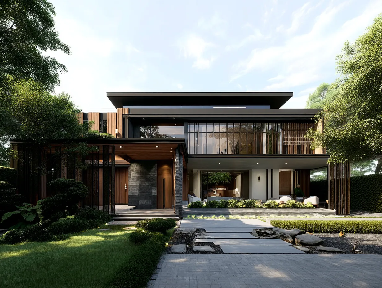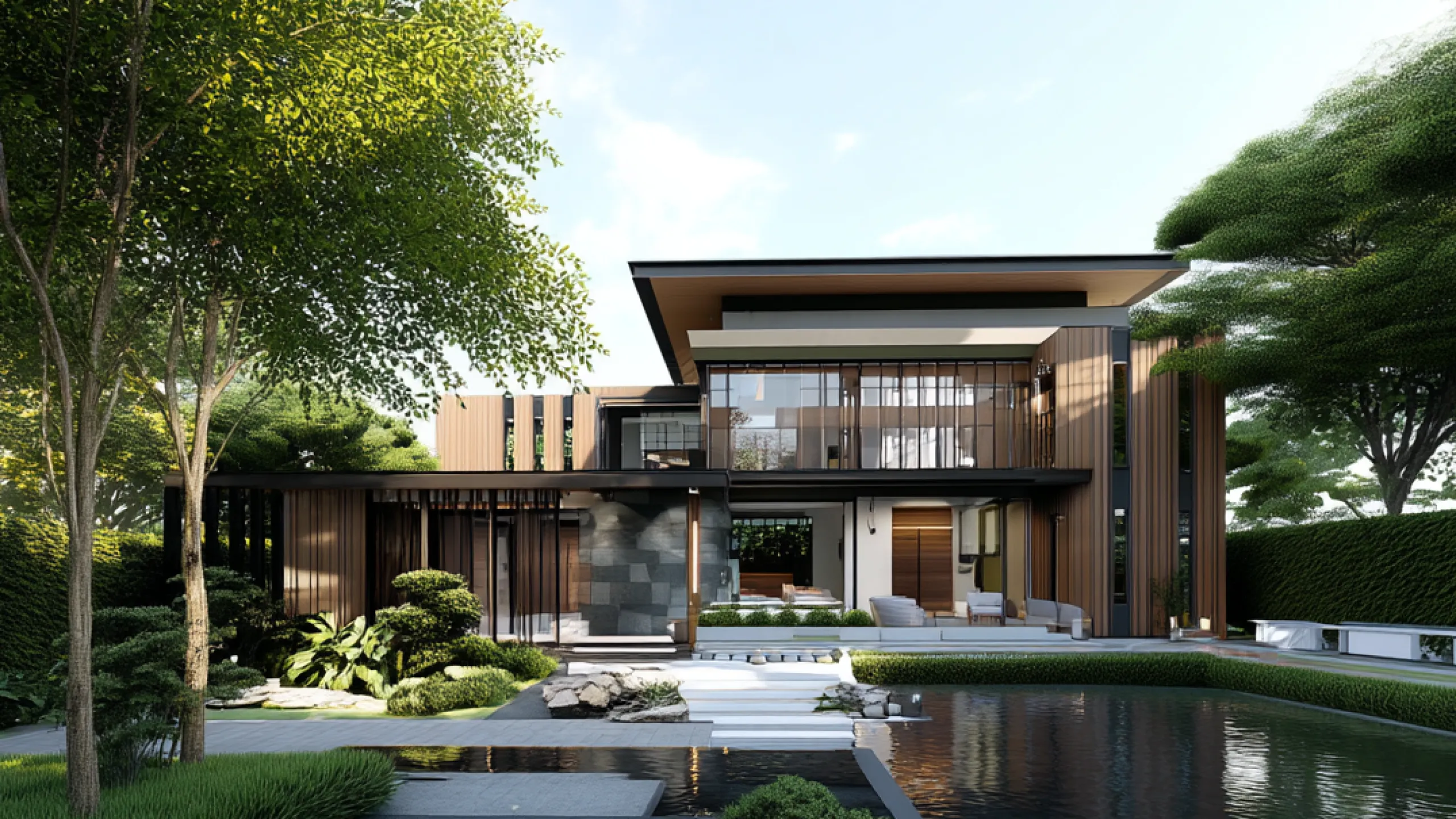 การเลือกใช้ระแนงไม้โทนอุ่นตัดกับโครงสร้างเหล็กและกระจกสีเข้ม สร้างมิติความหรูหราที่ดูเข้าถึงง่ายและเป็นมิตรกับสิ่งแวดล้อม ออกแบบให้ตัวบ้านขนานไปกับพื้นน้ำ เพื่อใช้การสะท้อนสร้างบรรยากาศที่นิ่ง สงบ และขยายขอบเขตการมองเห็นให้กว้างขึ้น ใช้ผนังกระจกใสบานใหญ่ (Large Glass Facade) เพื่อทลายกำแพงระหว่างพื้นที่ภายในและสวนภายนอก ให้ธรรมชาติกลายเป็นส่วนหนึ่งของการใช้ชีวิต การเล่นระดับของหลังคาทรงแบน (Flat Roof) และจังหวะของระแนงไม้แนวดิ่ง มอบรูปลักษณ์ที่ทันสมัยและมีเอกลักษณ์เฉพาะตัว