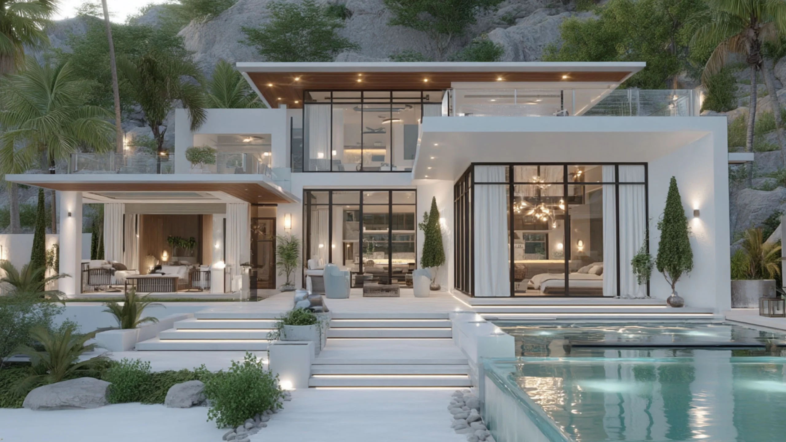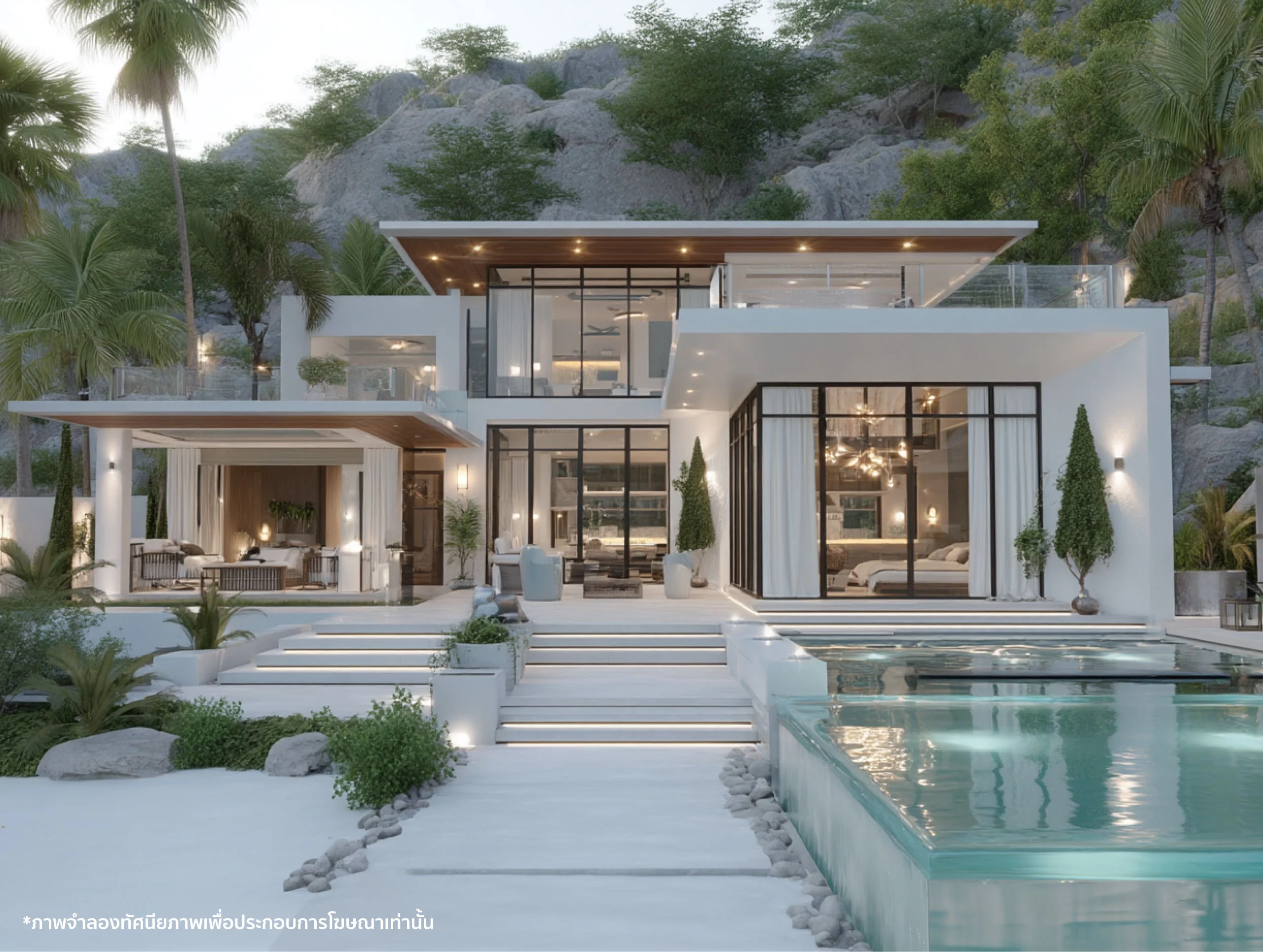 บ้านโมเดิร์นสีขาวบนเนินหิน ที่ออกแบบให้ทุกก้าวจากสระน้ำขึ้นสู่ตัวบ้าน เป็นประสบการณ์เหมือนเดินผ่านรีสอร์ตหรูริมภูเขา แต่เป็นบ้านพักอาศัยของครอบครัวคุณเอง สระรูปทรงเรียบง่ายขนานกับตัวบ้าน มีชานพัก sunbed ให้เอนตัวชมพระอาทิตย์ตก ระเบียงชั้นบนทำเป็น sky terrace สำหรับปาร์ตี้เล็กๆ หรือ private lounge