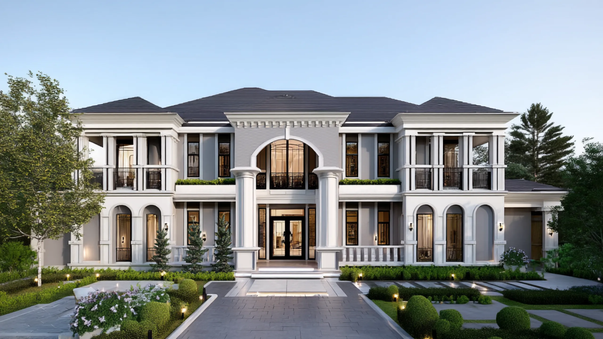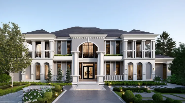 ตัวอาคารเน้นความโอ่อ่าด้วยการจัดวางพื้นที่แบบหน้ากว้างและสมมาตร มอบภาพลักษณ์ที่ดูภูมิฐาน สง่างาม ดั่งพระราชวังส่วนตัว การเลือกใช้หน้าต่างบานสูงตลอดแนวอาคาร ช่วยเปิดรับแสงธรรมชาติและสร้างความโปร่งโล่งภายในคฤหาสน์ที่ยังคงความเป็นส่วนตัวอย่างสูงสุด การคุมโทนสีเทา-ขาว สลับกับงานหินและโลหะสีเข้ม มอบความรู้สึกสุขุม นิ่งลึก และทรงพลังในเวลาเดียวกัน