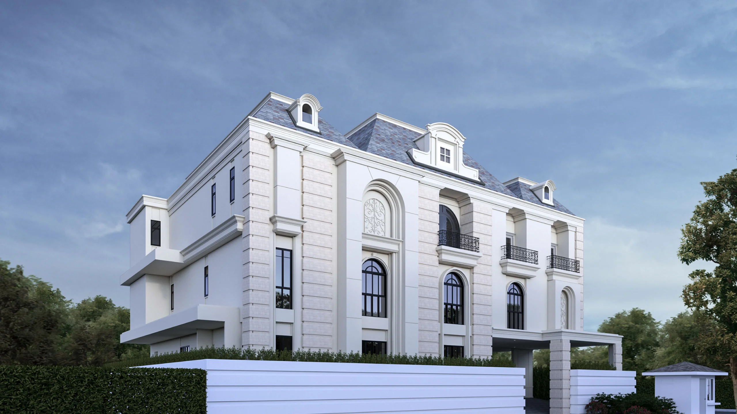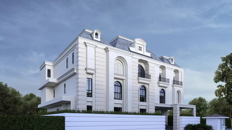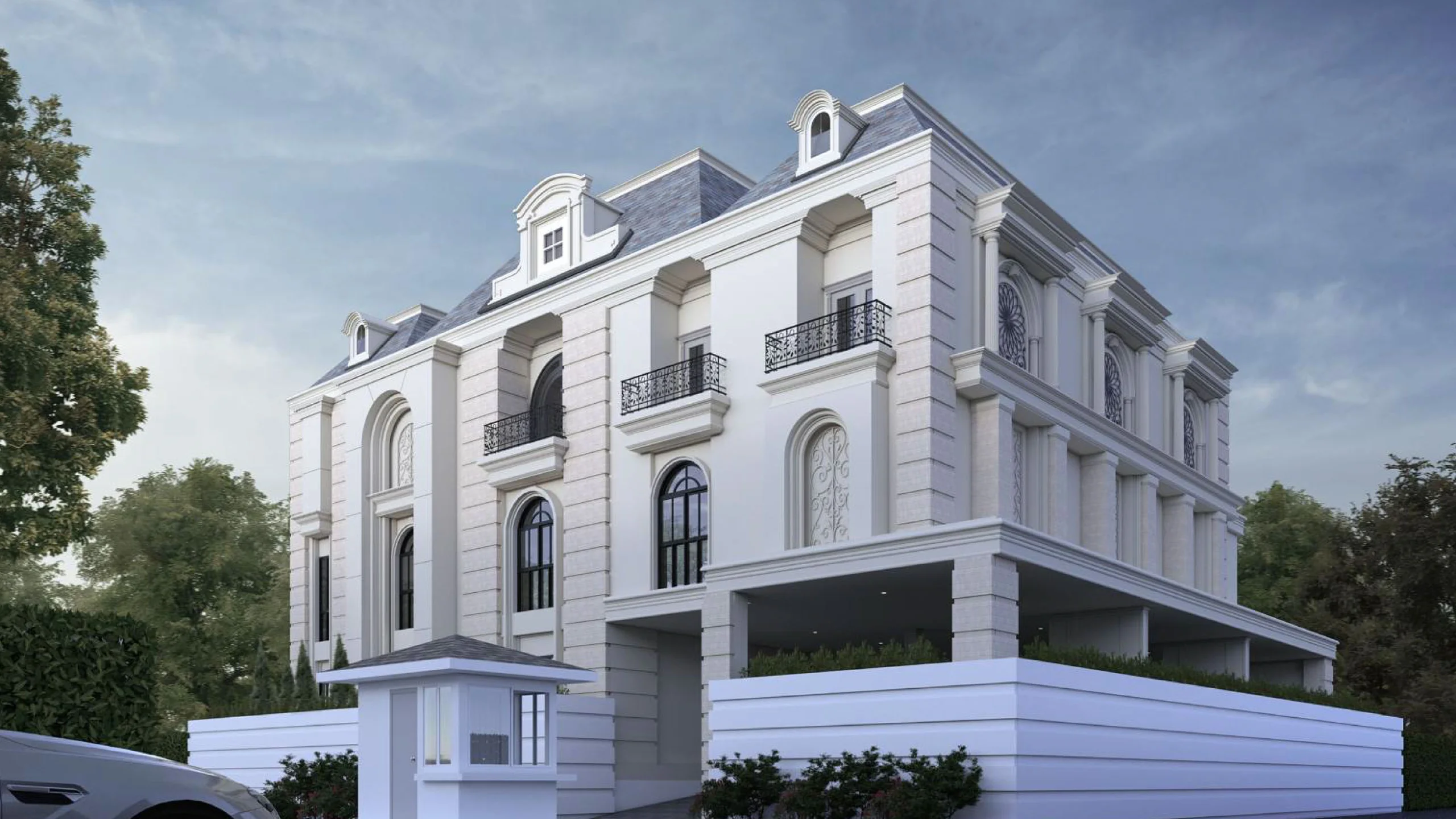 คฤหาสน์ 3 ชั้นสไตล์ฝรั่งเศสที่ตีความใหม่ให้ร่วมสมัย หน้าตาเหมือนบ้านในย่านหรูของปารีส แต่ฟังก์ชันด้านในออกแบบเพื่อการอยู่อาศัยของครอบครัวใหญ่ยุคใหม่ ฟาซาดด้านหน้าเล่นจังหวะเสาและซุ้มโค้งสมมาตร ใช้ช่องหน้าต่างโค้งสูงแบบฝรั่งเศส ระเบียงเหล็กดัดสีดำลายคลาสสิกเป็นจุดเด่น ช่วยให้บ้านดูหรูและมีรายละเอียด