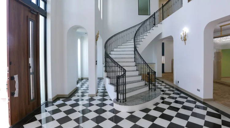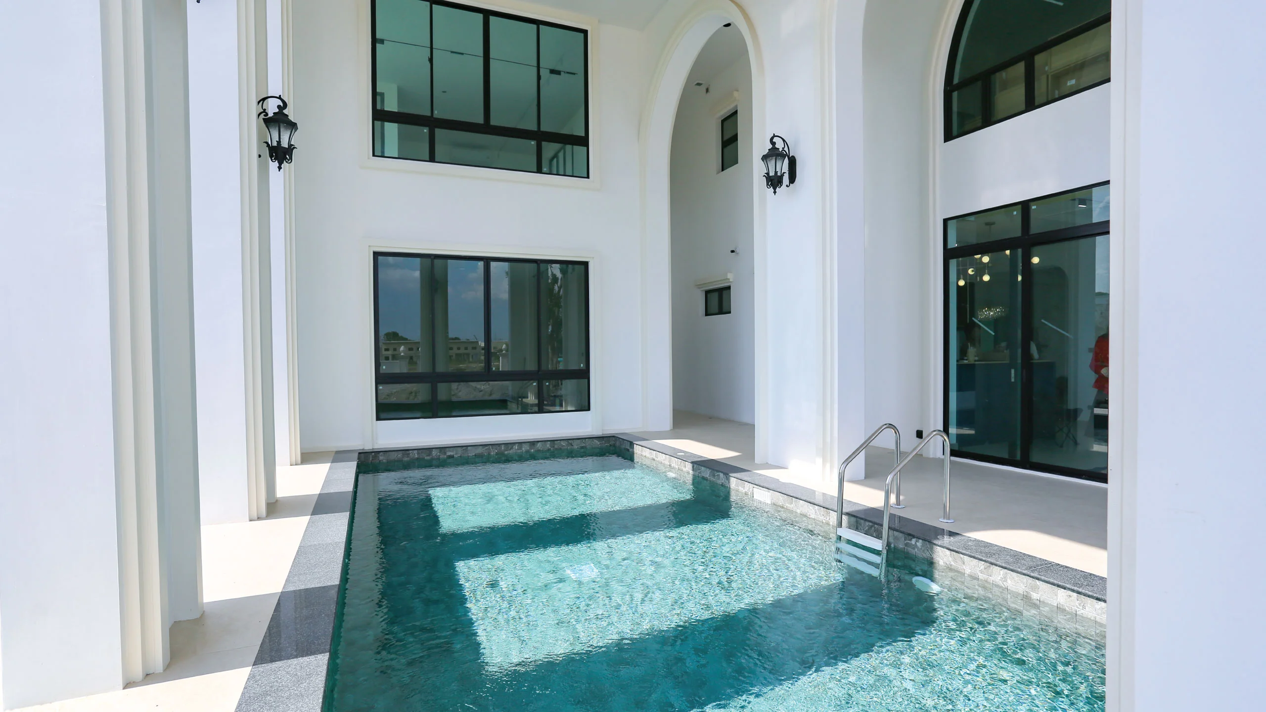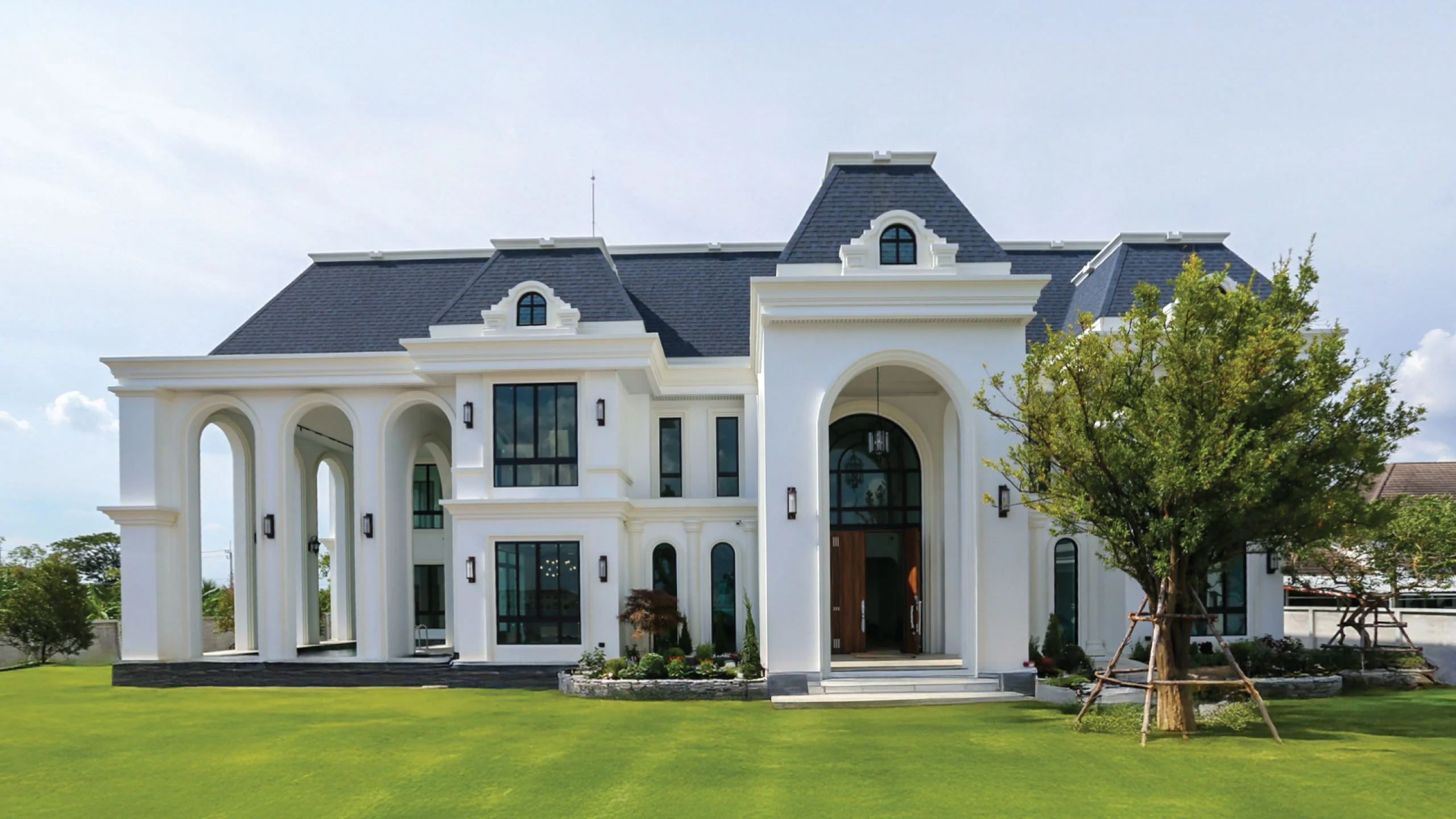 เอกลักษณ์ด้านหน้า ฟาซาดเด่นด้วย ซุ้มโค้ง (Grand Arch) สูงโปร่ง โถงทางเข้า Double-Volume สไตล์คฤหาสน์ยุโรป บ้านดูสง่างาม ออกแบบให้กรอบหน้าต่างสีเข้มช่วยคมชัดแบบคอนทราสต์บนผนังปูนฉาบสีขาว ทางเดินโค้ง…จากพื้นที่สาธารณะสู่ความเป็นส่วนตัว ระเบียงคอลอเนด (Colonnade) ฝั่งซ้ายทำหน้าที่เป็น “เฉลียงกึ่งเอาต์ดอร์” พาแขกจากสนามหน้าเข้าสู่โถงรับรองอย่างนุ่มนวล ระหว่างทางมีจังหวะโค้ง–ทึบ–โปร่งที่ออกแบบเพื่อ กรองแสงบ่าย/พรางสายตา ให้ได้ทั้งความอลังการและความสบายตา