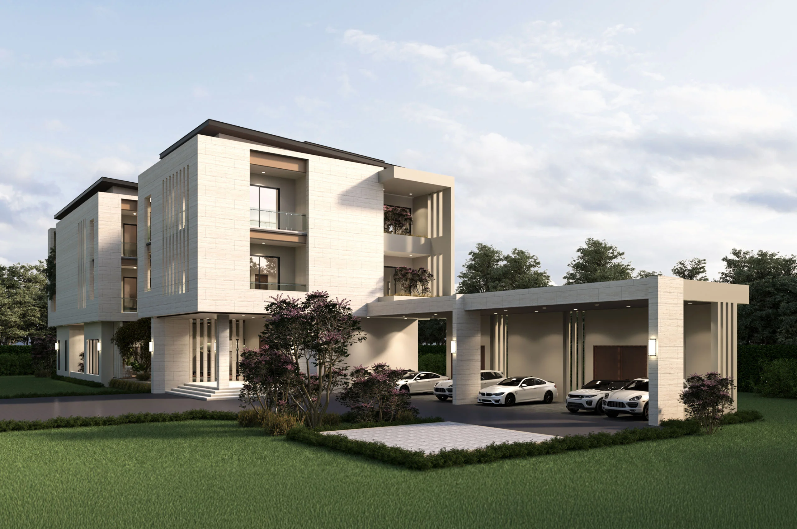 บ้านโมเดิร์น 3 ชั้นที่ออกแบบให้เป็น คอมปาวด์ส่วนตัว ในตัวเอง แยกโซน “การมาถึง–โชว์รถ–ใช้ชีวิต” อย่างชัดเจน เหมือนอยู่ในไพรเวตคลับของครอบครัว ผนังหิน/กระเบื้องสีครีมอ่อน ลายเท็กซ์เจอร์บางๆ ให้ความรู้สึก หรูแบบเท่ๆ นิ่งๆ