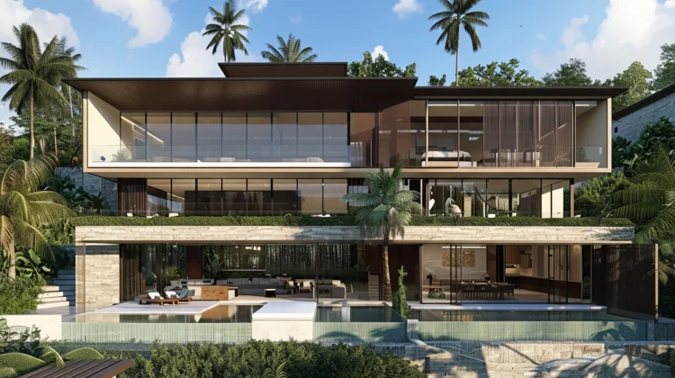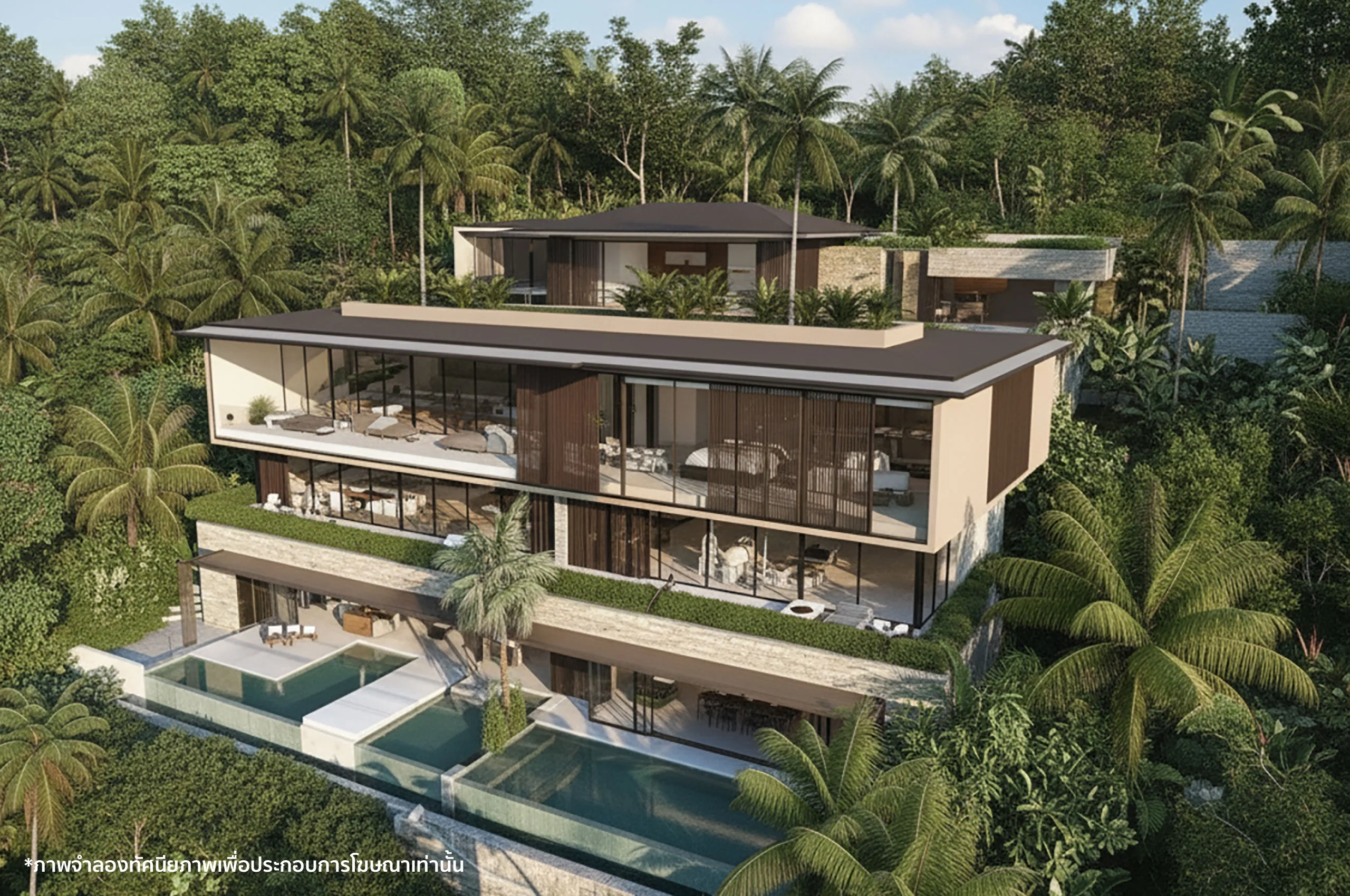 บ้านวิลล่าซ้อนชั้น ที่เปิดมุมมอง 180° ให้ทุกระดับของชีวิต บ้านออกแบบเป็นระเบียงขั้นบันได (terrace) ไล่จากสระด้านล่างขึ้นไปจนถึงชั้นห้องนอนด้านบน ทุกชั้นมองเห็นวิว เปิดผนังกระจกยาวให้รู้สึกเหมือนอยู่รีสอร์ตบนเนินเขา