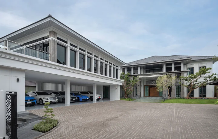 บ้านหลังนี้ไม่ได้สวยแค่ฟาซาด แต่ “ฉลาดกับภูมิอากาศไทย” ในทุกดีเทล ตั้งแต่ศาลาหน้าบ้านแบบ Porte-Cochère ที่สูงโปร่ง สะดวกต่อการรับ-ส่ง รับแขกได้ไม่เปียกฝน ไปจนถึงชายคายาว ระเบียงบังแดด และช่องเปิดที่ออกแบบให้ลมเดินดี ภาพรวมจึงหรู นิ่ง และอยู่จริงได้สบายตลอดปี